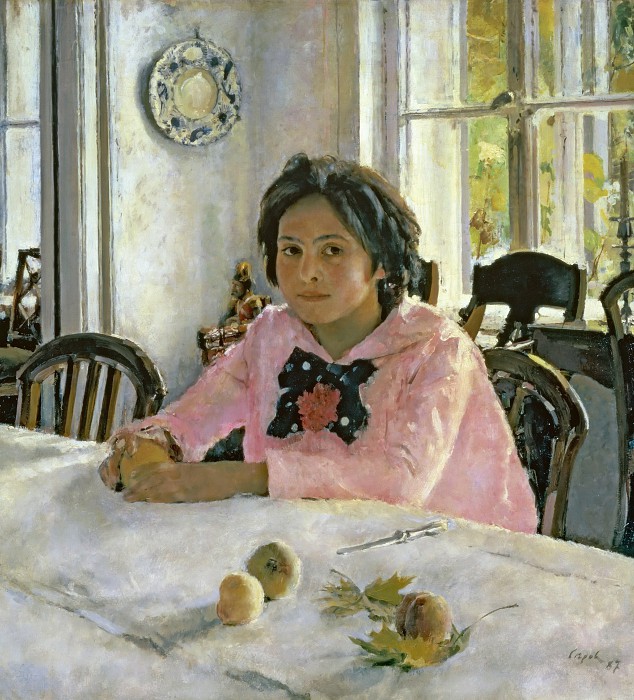 Після подорожі по Італії Валентин Сєров повертається в Абрамцево, де і створює свій найвідоміший і дійсно «Отрадне» твір «Дівчинка з персиками», на якому зображена старша дочка Сави Мамонтова Віра. На момент створення цього шедевра Сєрову було всього 22 роки, але його професіоналізм дозволив наповнити свою роботу відразу декількома жанрами: на картині ми бачимо і портрет, і натюрморт, і пейзаж за вікном. Всупереч канонам стрімкого імпресіонізму, Сєров писав картину щодня близько трьох місяців, ніж, за його власними словами, «змучив дванадцятирічну Верочку». Але у глядача все ж складається враження, що дівчинка присіла за все на хвилинку, і художнику вдалося зловити момент і поділитися з нами своїм скороминущим, світлим і щасливим враженням.